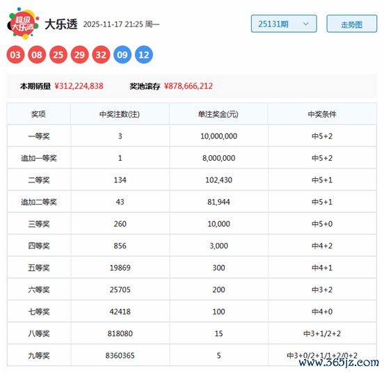 大乐透第2025131期开出奖号为:03、08、25、29、32+09、12。其中前区奇偶比为3:2,三区比为2:0:3,大小比为3:2,后区开出一奇一偶组合。